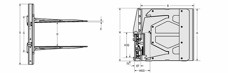| Capacity 承載能力(kg) | Catalog Order NO 型號 | Mounting Class 安裝等級 | Load Center載荷中心(mm) | Opening Range張臂范圍(mm) | Arm Height臂高A(mm) | Arm Length臂長B(mm) | Arm Thickness臂厚E(mm) | Overall Width總寬D(mm) | Overall Height總高H(mm) | Vertcial Center Of Gravity垂直重心VCG(mm) | Hook Spread上鉤外側間距(mm) | Weight 自重(kg) | Effective 失載距ET(mm) | Horizontal Center of Gravity 水平重心CGH(mm) |