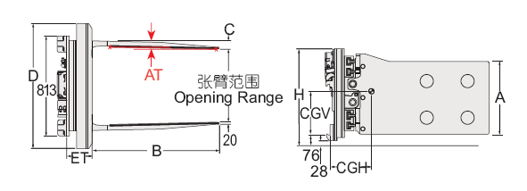 Capacity 承載能力(kg)Catalog Order NO 型號Mounting Class 安裝等級 Opening Range張臂范圍(mm)Arm Height臂高A(mm)Arm Length臂長B(mm)Arm Thickness臂厚C(mm)Overall Height總高H(mm)Frame Width 框架寬度D(mm)Arm Toe in內扣量AT(見注5)(mm)Weight 自重(kg)Effective 失載距ET(mm)Horizontal Center of Gravity 水平重心CGH(mm)